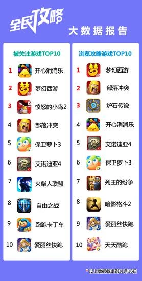 “全民手游攻略”APP中被关注最多手游TOP10和被浏览攻略最多手游TOP10: